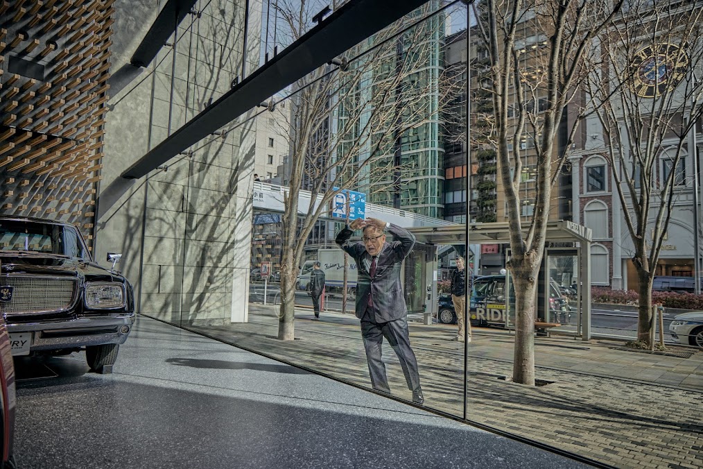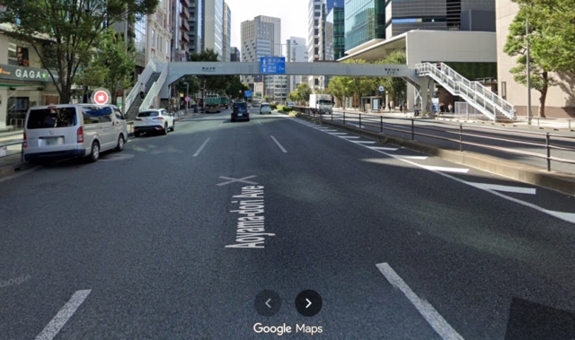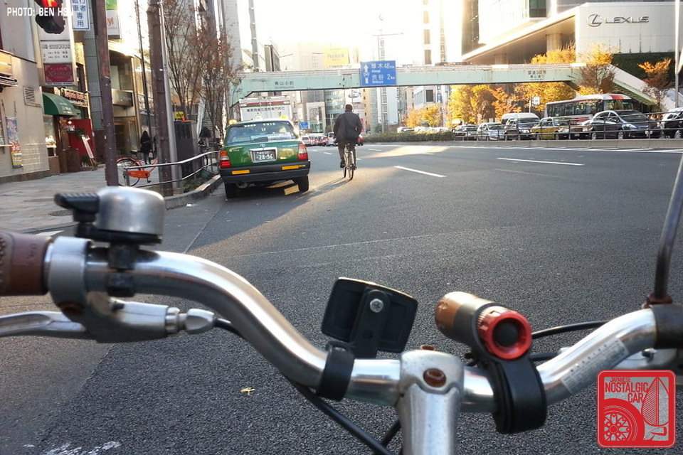 Here’s a photo I took while trying to juggle my phone, my mamachari handlebars, and the mirrored traffic rules in my head at that exact location in 2013. Notice the prominent Lexus branding on the building on the right.