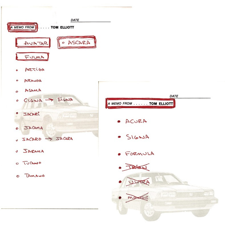 With Soichiro Honda’s name already being used by the parent company, Honda couldn’t just slap the founder’s name on the building. Brainstormed names are typically guarded from public view, but for its 40th birthday Acura gave us a peek behind the curtain by releasing a couple of memos from the desk of Tom Elliott, then Vice President of Automobile Operations at American Honda, on names that could have been.